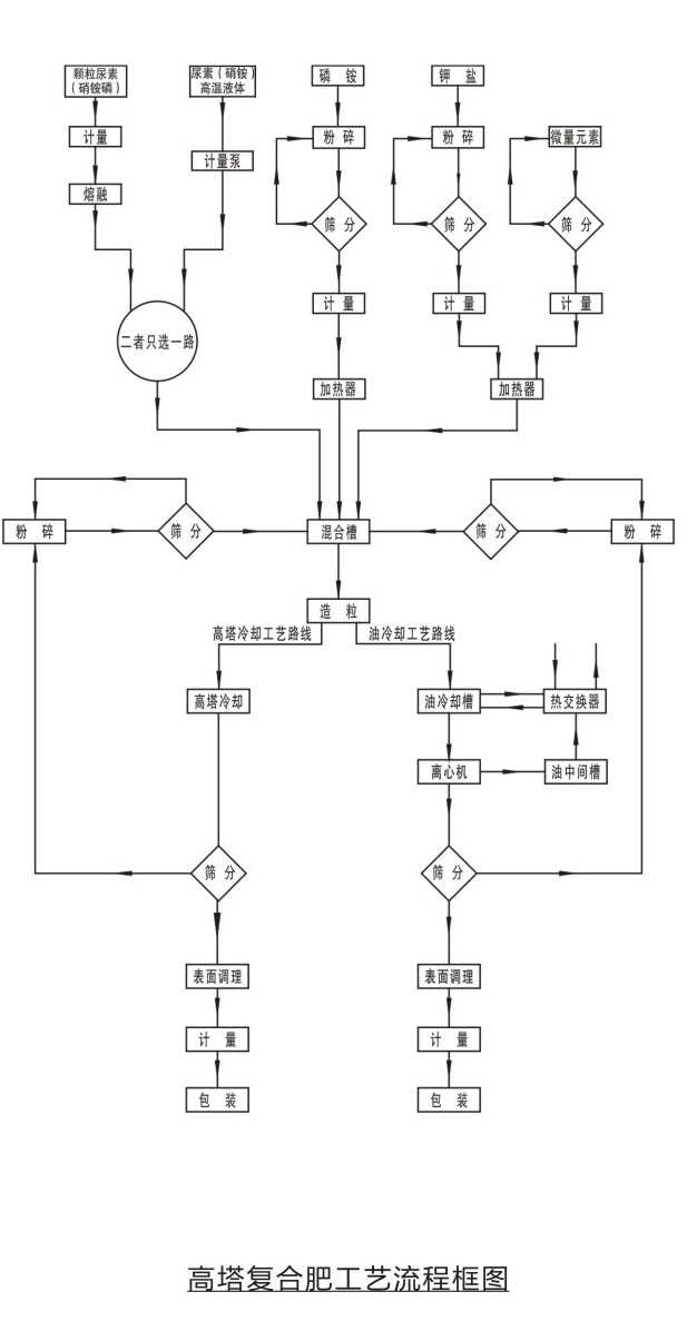 工藝原理固體尿素或硝銨(硝銨磷等)通過熔融器加熱熔融后成為熔融液,也可以直接使用蒸發(fā)濃縮后的液態(tài)尿液(硝銨)液中加入相應的磷肥、鉀肥、填料及添加劑制成 混合料漿?;旌狭蠞{進入高塔造粒設備進行噴灑造粒,物料在從高塔下降過程中,與塔底上升氣流阻力相互作用,與其進行熱交換后降落到塔底,落入塔底的物料,經篩分表面處理后得到顆粒復合肥。
